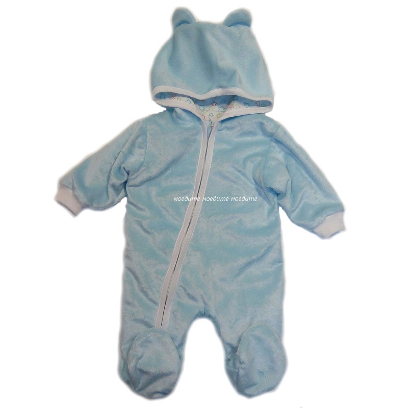 Комбинезон с капюшоном декорированный ушками, с закрытыми ножками, рукавчики на манжетиках, спереди на молнии до конца одной ножки.